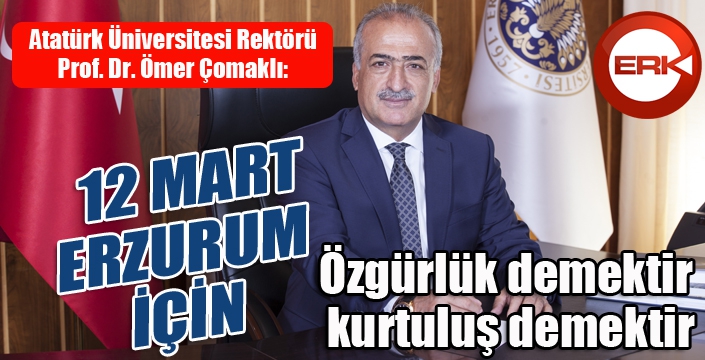 Rektör Çomaklı yayımladığı mesajda şu ifadelere yer verdi: “12 Mart, Erzurum için özgürlük demektir, kurtuluş demektir, topraklarını düşmandan, vatanını hainden temizlemek, ay yıldızlı bayrak altında yaşamanın beratını göğsünde taşımak demektir. Barda salladığı hançerdir, yürekli kadınların elindeki satırdır, tabyasından yükselen Allah Allah sesidir 12 Mart.