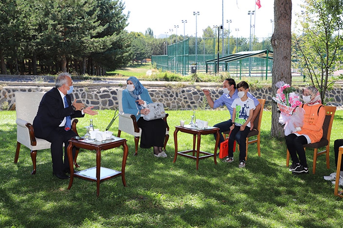 ERKHABER / ERZURUM - Atatürk Üniversitesi Rektörlüğüne yeniden atanan Prof. Dr. Ömer Çomaklı, hayırlı olsun dileklerini iletmek üzere gelen misafirlerini pandemi kuralları eşliğinde kabul etti.