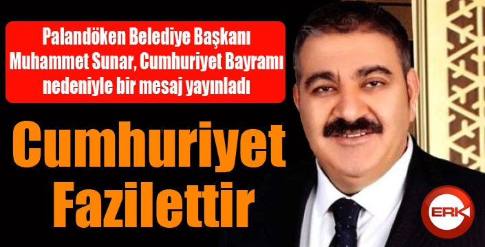 ERKHABER / ERZURUM - Palandöken Belediye Başkanı Sunar, “Cumhuriyet, Türk Milletinin uğruna can adadığı bir değer; Türkiye, sınırları şühedanın aziz kanıyla çizilmiş mübarek bir coğrafyadır. Milli birliği, kardeşliği, huzur ve istikrarıyla cihana yön veren Türkiye, 2023 hedefine emin bir istikamette ilerlemektedir.” dedi.