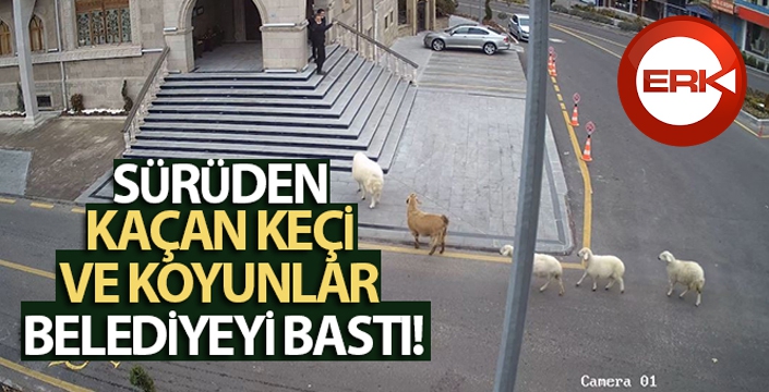 ERKHABER / ERZURUM - Göre yolunda çoban Hasan Ünbulan'ın otlattığı sürüden kaçan bir koç, bir keçi ve üç koyun Nevşehir Belediyesi önüne geldi. Binaya girmeye çalışan koç, keçi ve koyunlara güvenlik görevlileri engel olmaya çalıştı. Hayvanlar kendilerine engel olmaya çalışan güvenlik görevlilerine ve bir belediye çalışanına saldırdı. Daha sonra Nevşehir Belediyesi Mali Hizmetler odasına girmek isteyen hayvanlar, bir genç tarafından uzaklaştırılmak istenince genci kovaladı. Belediye çalışanları kapıya siper olarak hayvanların içeri girmesini engellerken, Nevşehir Belediyesi Hayvan Kasabası görevlilerine haber verildi. Gelen görevliler koç, keçi ve koyunları yakalayarak Hayvan Kasabası'na götürdü. Yaşananlar ise güvenlik kameraları tarafından saniye saniye görüntülendi.