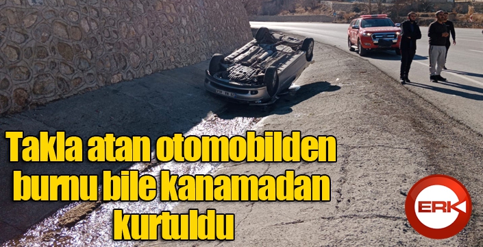 Alınan bilgiye göre, Aşkale'nin Pırnakaban köyü mevkiinde Y.A. kontrolündeki 28 NA 464 plakalı otomobil, sürücüsünün bir anlık dalgınlığı ve direksiyon hakimiyetini kaybetmesi sonrasında savrulup, yolun karşı tarafında takla atarak durabildi. Otomobil sürücüsü, soğukkanlı bir şekilde, burnu bile kanamadan takla atan araçtan kendi gayretleriyle çıktı. İlçe Jandarma ve Erzurum Büyükşehir Belediyesi Aşkale itfaiye ekipleri kısa sürede olay yerine gelerek yolda trafik akışını kontrollü olarak sağladı.