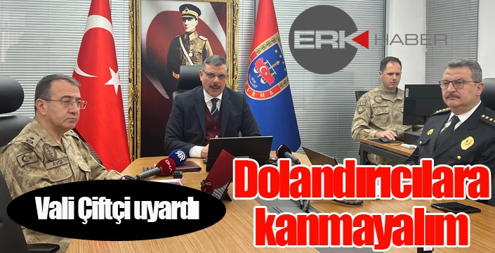 ERKHABER / ERZURUM - Erzurum Valisi Mustafa Çiftçi, aylık asayiş toplantısında yaptığı değerlendirmede, "2024-2025 yılı ilk aylık değerlendirmede dolandırıcılık olaylarında yüzde 5'lik bir azalma var ve ilimiz açısından memnuniyet verici. Uyarılarımızın etkili olduğuna inanıyorum. Ancak dolandırıcılar hala iş başında ve vatandaşlarımızı kandırmak, tuzaklarına düşürmek için gayret ediyorlar. Vatandaşlarımız kendisini asker, polis ya da savcı olarak tanıtan kişilere rağbet etmemeleri, onlara kanmamaları noktasında tekrar bir hatırlatma yapmak isterim" dedi.