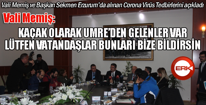 Vali Memiş, konuşmasının son kısmında umreden gelen vatandaşların karantinaya alınması gerektiği, bu yüzden il sınırlarına kaçak şekilde girmemeleri gerektiği konusunda uyarılarda bulunarak, “Umreden gelen vatandaşlarımız dün bir otobüs firmasını tutarak Erzurum’a gelmeye çalışıyorlardı. Yaklaşık 27 kişinin geldiğini duyunca tedbirlerimizi alarak Konya ve Ankara’ya yolladık. Bununla birlikte bir şekilde kaçak olarak umreden gelenler olduğunu biliyoruz. Vatandaşlarımız lütfen bunları bize bildirsinler. Bu vatandaşlarımızın mutlaka karantinaya alınması lazım. Bu kişileri biz tespit edince hemen alıyoruz. Sağlık taramasının ardından riskli olanları hemen karantinaya alıyoruz” dedi.