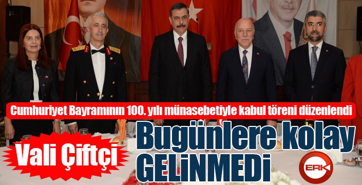 Törende davetlilerin Cumhuriyet Bayramını kutlayan Vali Çiftçi, günün anlam ve önemini belirten bir konuşma yaptı. Konuşmasında Türkiye Cumhuriyeti’nin kuruluş aşamasına gelene kadarki sürece vurgu yapan Vali Çiftçi şunları ifade etti: