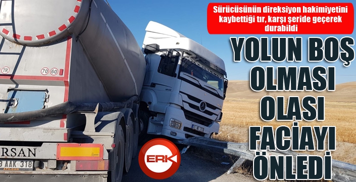 ERKHABER / ERZURUM - Edinilen bilgiye göre, Erzurum’un Aşkale ilçesi Eski Cirit Meydanı mevkiinde meydana gelen trafik kazasında 31 NE 717 plakalı tır, sürücüsünün direksiyon hakimiyetine kaybetmesi sonucu önce yol ortasında bulunan refüje ardından karşı şeride geçerek makaslayarak durabildi. Kazada can kaybı yaşanmazken sabah erken saatlerinde yolun boş olması da olası bir faciayı engellemiş oldu.