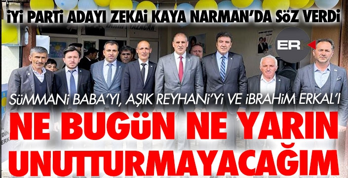 Peri Bacaları gibi hiçbir yere nasip olmayacak doğal güzelliklere sahip Narman’ın Aşık Sümmani Baba ile de özdeş bir ilçe olduğunu ifade eden Zekai Kaya, “Erzurum’un kültürel anlamda önemli değerlerinin unutulduğunu, isimlerinin bile çoğu zaman akıllara gelmediğini hepimiz biliyoruz. Deyişleri ve türküleri ile duygulandığımız Erzurumlu Emrah’ın, Aşık Reyhani’nin, Sümmani Baba’nın ve İbrahim Erkal'ın isimlerinin unutulmaması, düzenlenecek etkinlikler, şenlikler, kültür programları ile sürekli anılmaları ve genç nesillere anlatılmaları gerekir. İYİ Parti iktidarında Erzurum’un kültür hayatını zenginleştirmek ve diri tutmak için elimden geleni yapacağım. Bu konuda söz veriyorum. İlk işlerimden birisi de Narman Peri Bacaları’nı marka haline getirmek olacak” dedi.